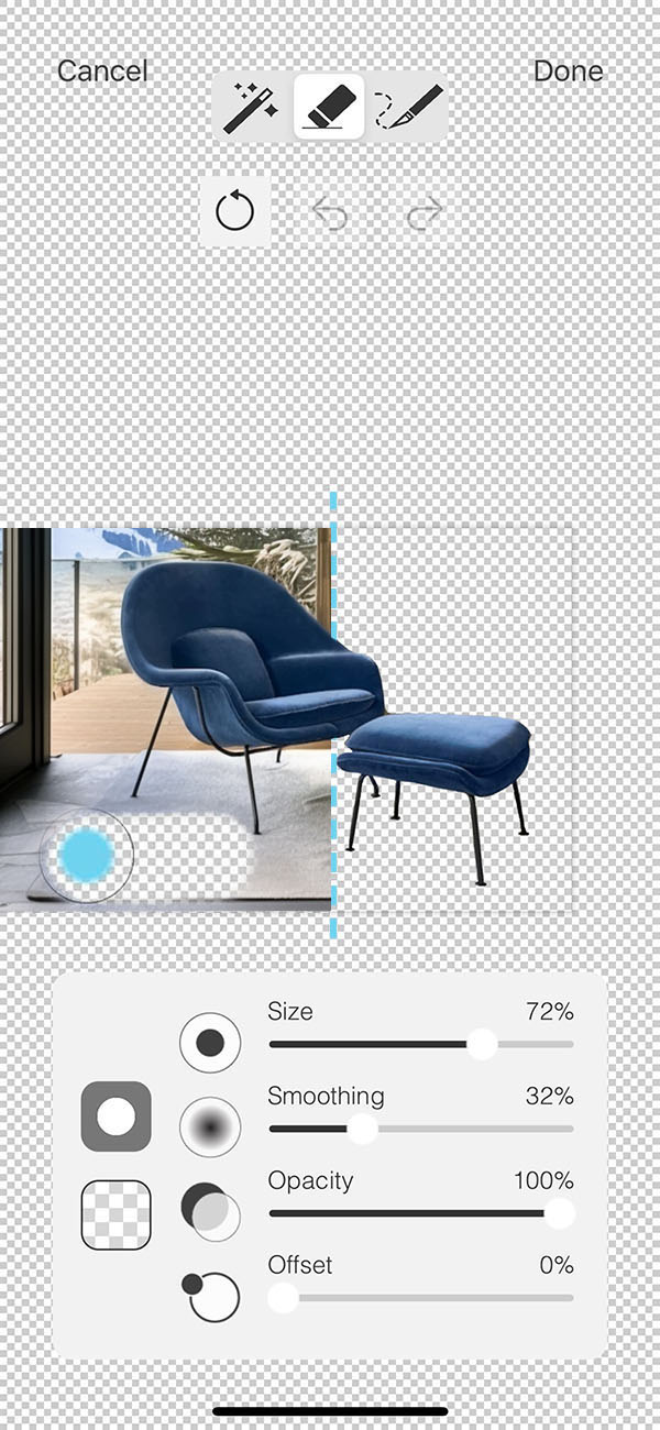 The new eraser will allow you to sweep away unwanted items in any photo and zoom in to perfect the details. Tap the Shape button to switch your brush between square and circle. Adjust your Size, Smoothing, and Opacity sliders to set your brush. If you're using your finger, adjust the Offset slider so you can see your brush as you move your finger over the screen.