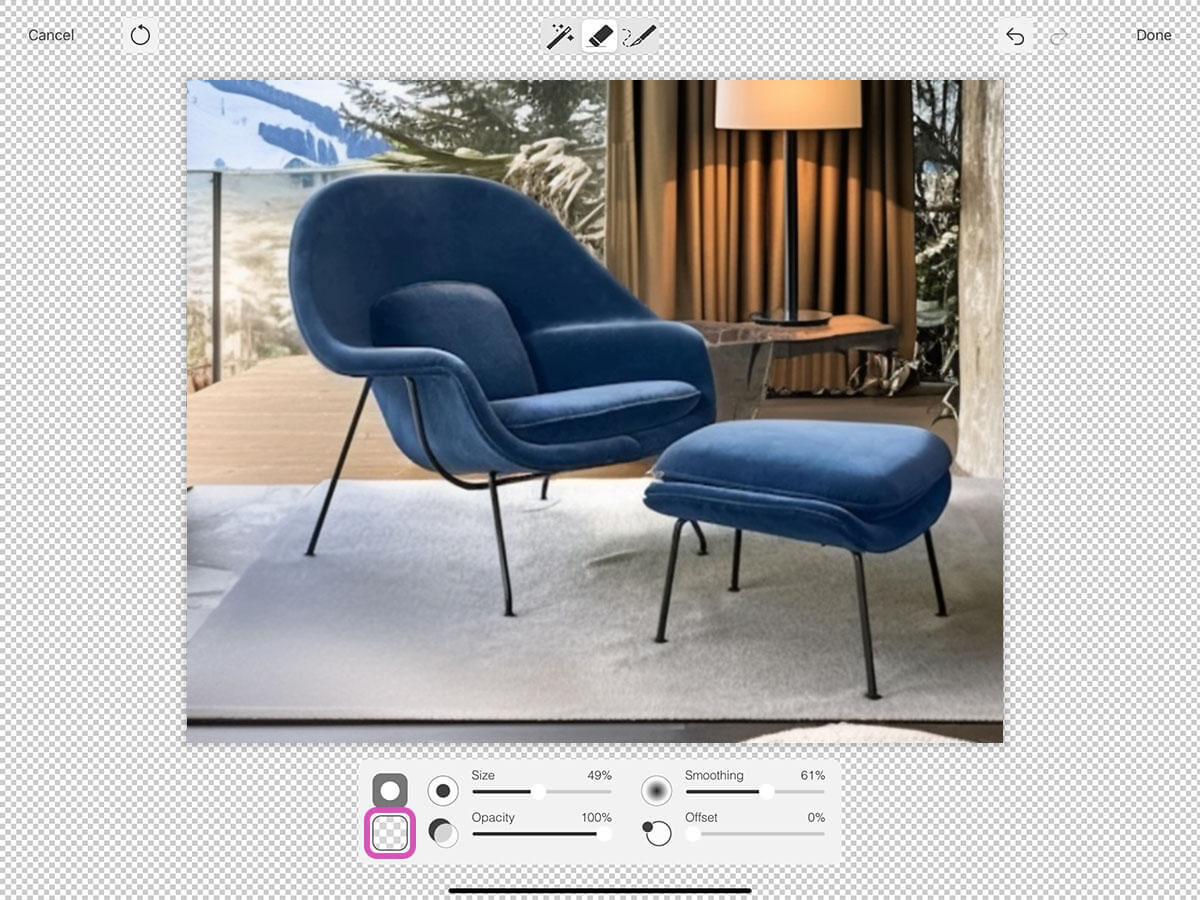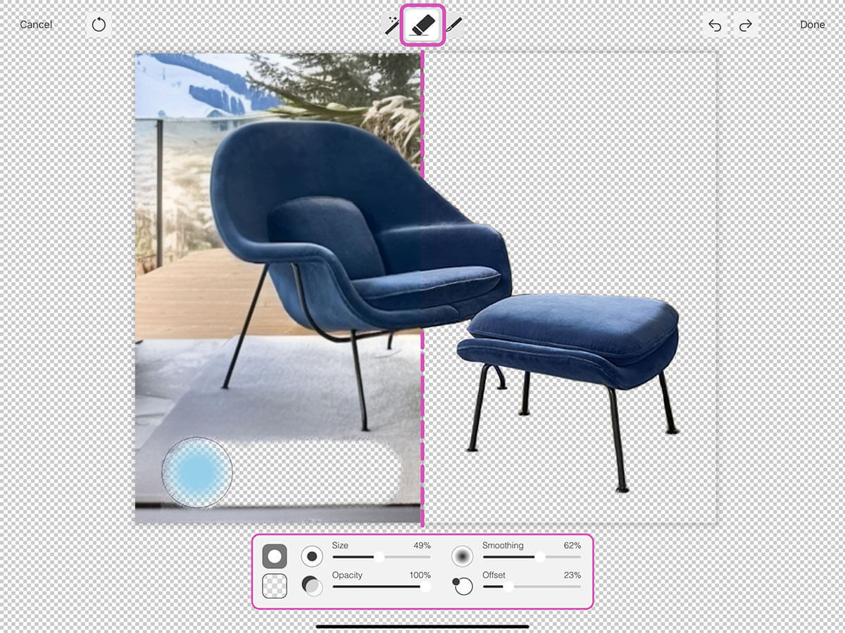 The new eraser will allow you to sweep away unwanted items in any photo and zoom in to perfect the details. Tap the Shape button to switch your brush between square and circle. Adjust your Size, Smoothing, and Opacity sliders to set your brush. If you're using your finger, adjust the Offset slider so you can see your brush as you move your finger over the screen.