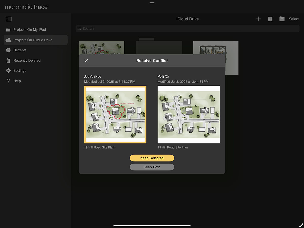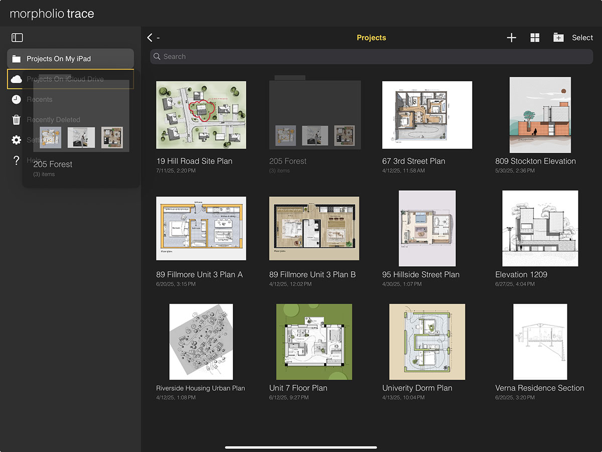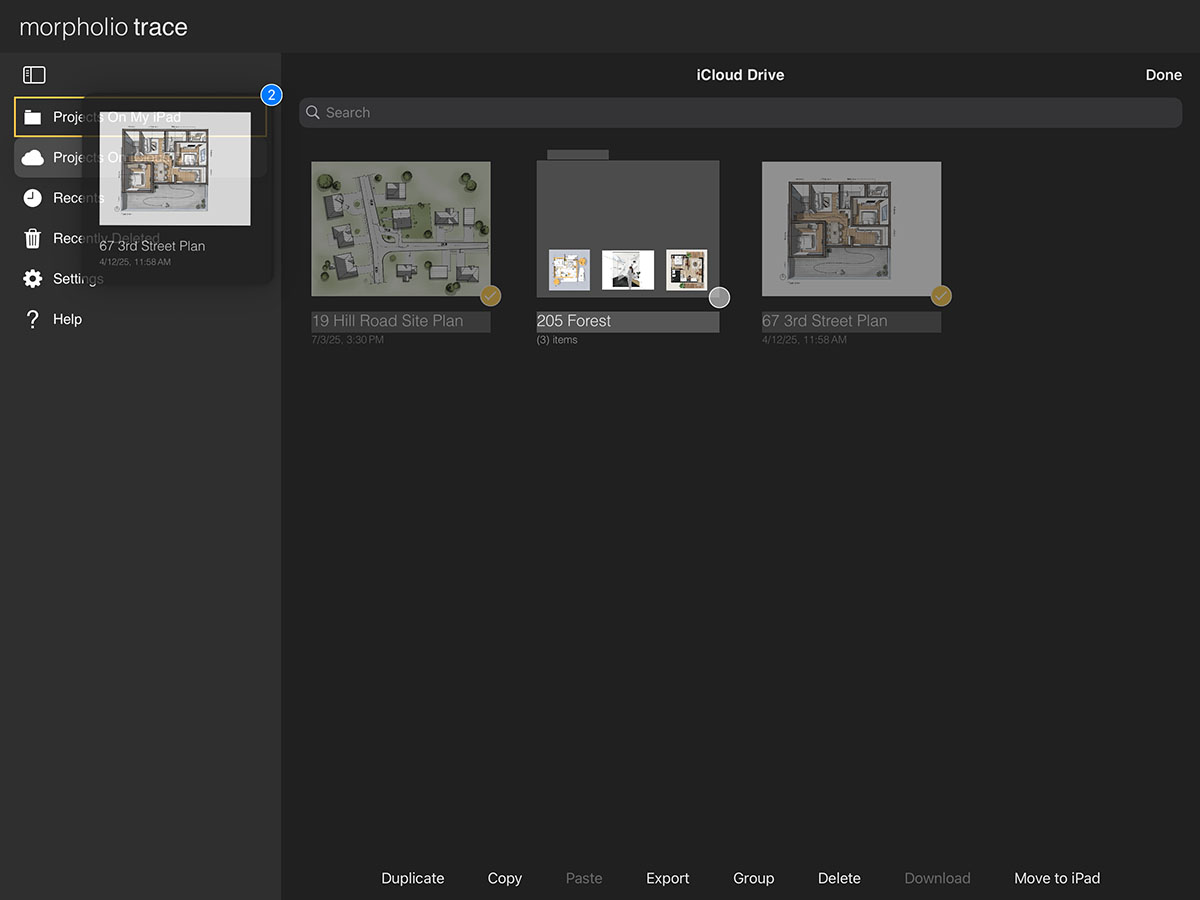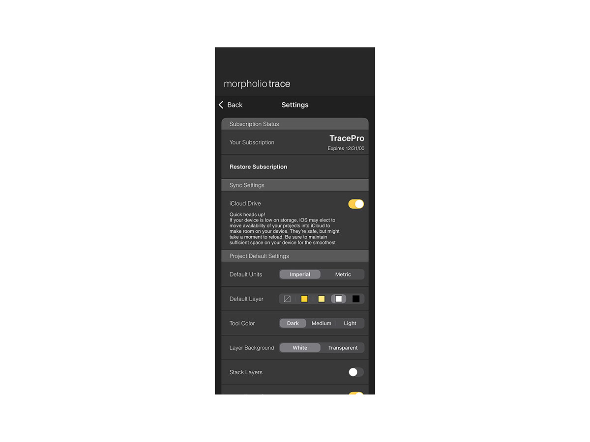 iCloud Drive makes it easy to protect your work and access your projects across all your personal devices. By enabling iCloud Drive, you can back up and sync your projects seamlessly. Simply turn on iCloud Drive in your Trace settings, then move your files into the "Projects on iCloud Drive" folder within the app. Any project in this folder will be available on all iOS devices signed in with the same Apple ID and with iCloud enabled.