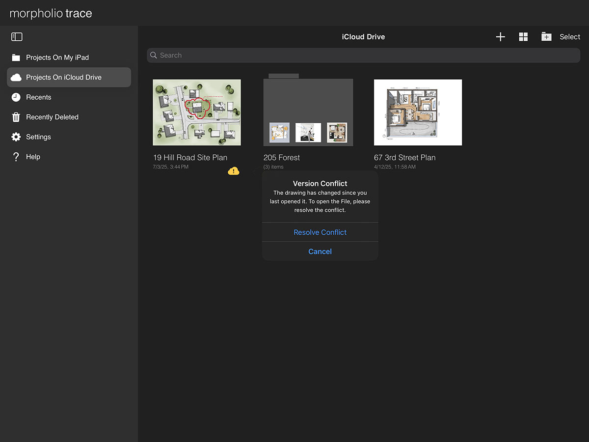 First, tap on the conflicted project and select "Resolve Conflict."